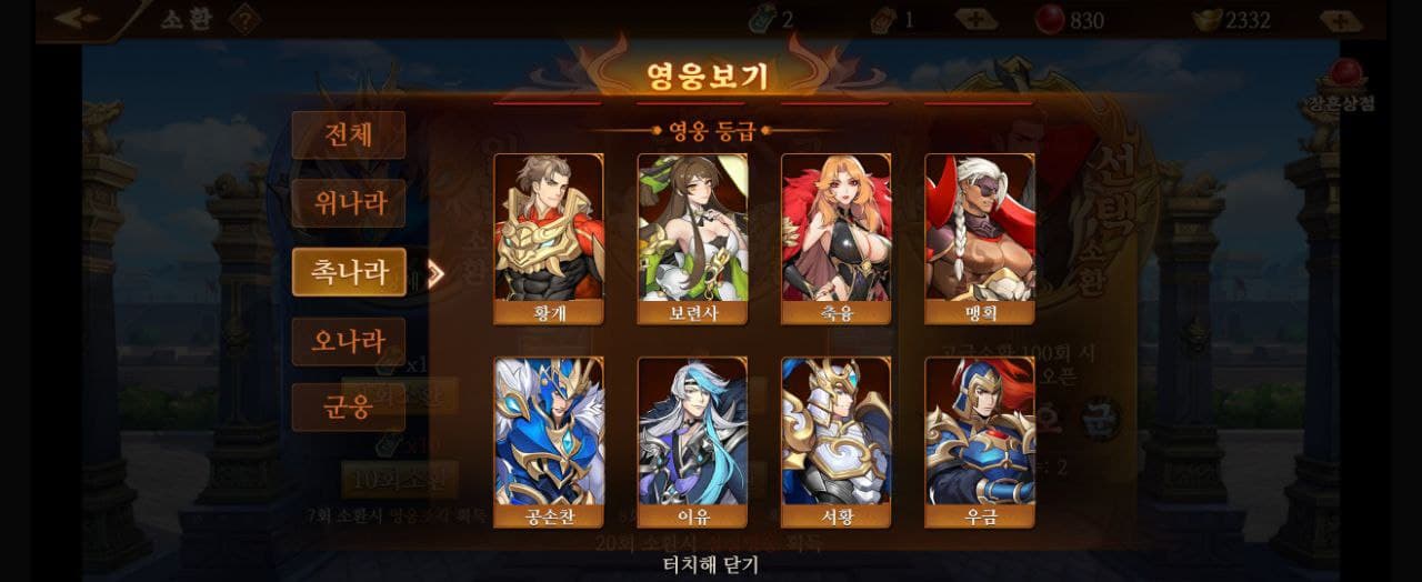 영웅은 나라별 영웅이 있고 또 영웅의 등급은 색깔별로 전설, 영웅, 희귀 나뉘게 됩니다.