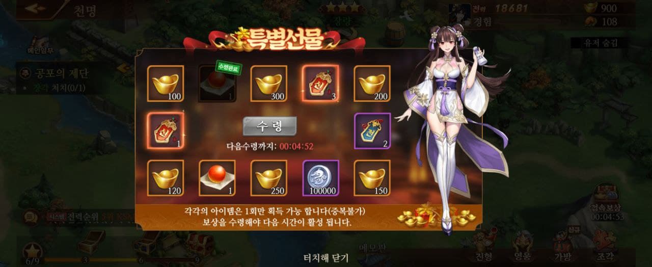 수집형 RPG는 보통 리세마라를 하는데 파이널 삼국지는 굳이 할 필요는 없는 것 같습니다. 혜택이 좋아서 계속 영웅을 뽑을 수 있습니다. 총 5일 동안 100회 뽑기가 가능하고 또 이벤트 보상 등 혜택이 많기 때문에 무과금으로도 즐길만한 수집형 RPG 게임이 되겠습니다.